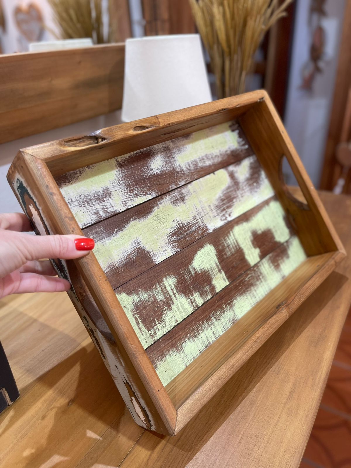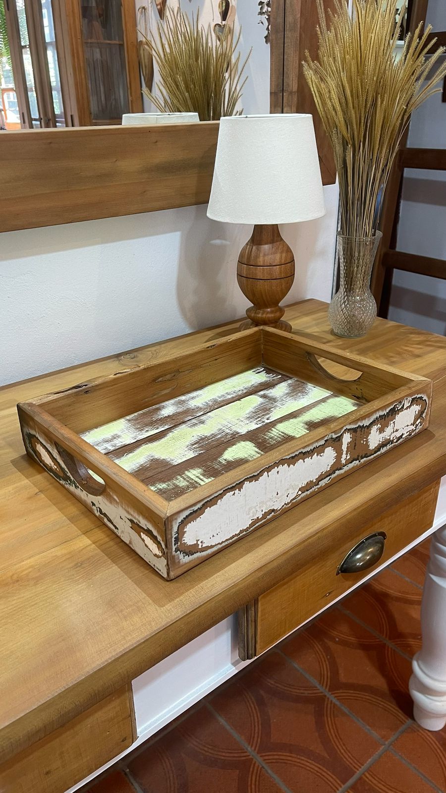 Essa bandeja em madeira de demolição carrega toda a essência do estilo farmhouse: rústica, charmosa e cheia de história. O acabamento desgastado com pintura branca revela as marcas naturais do tempo, reforçando a estética campestre com autenticidade.