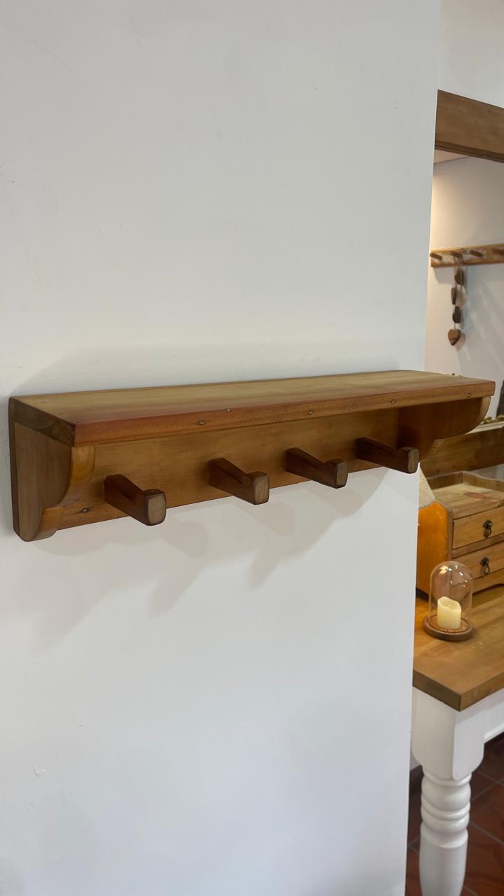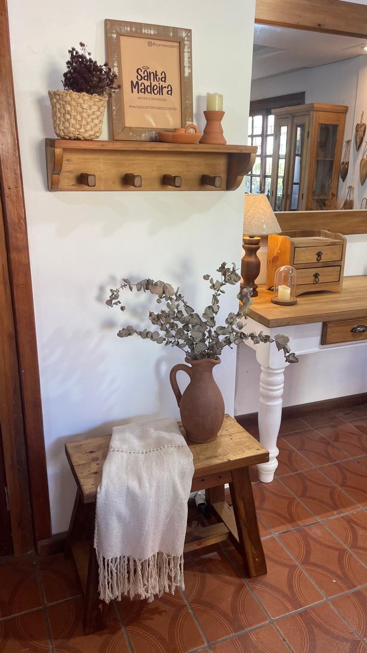 Produzido artesanalmente em madeira de demolição, possui prateleira superior para decoração e ganchos inferiores para organizar bolsas, casacos e acessórios.