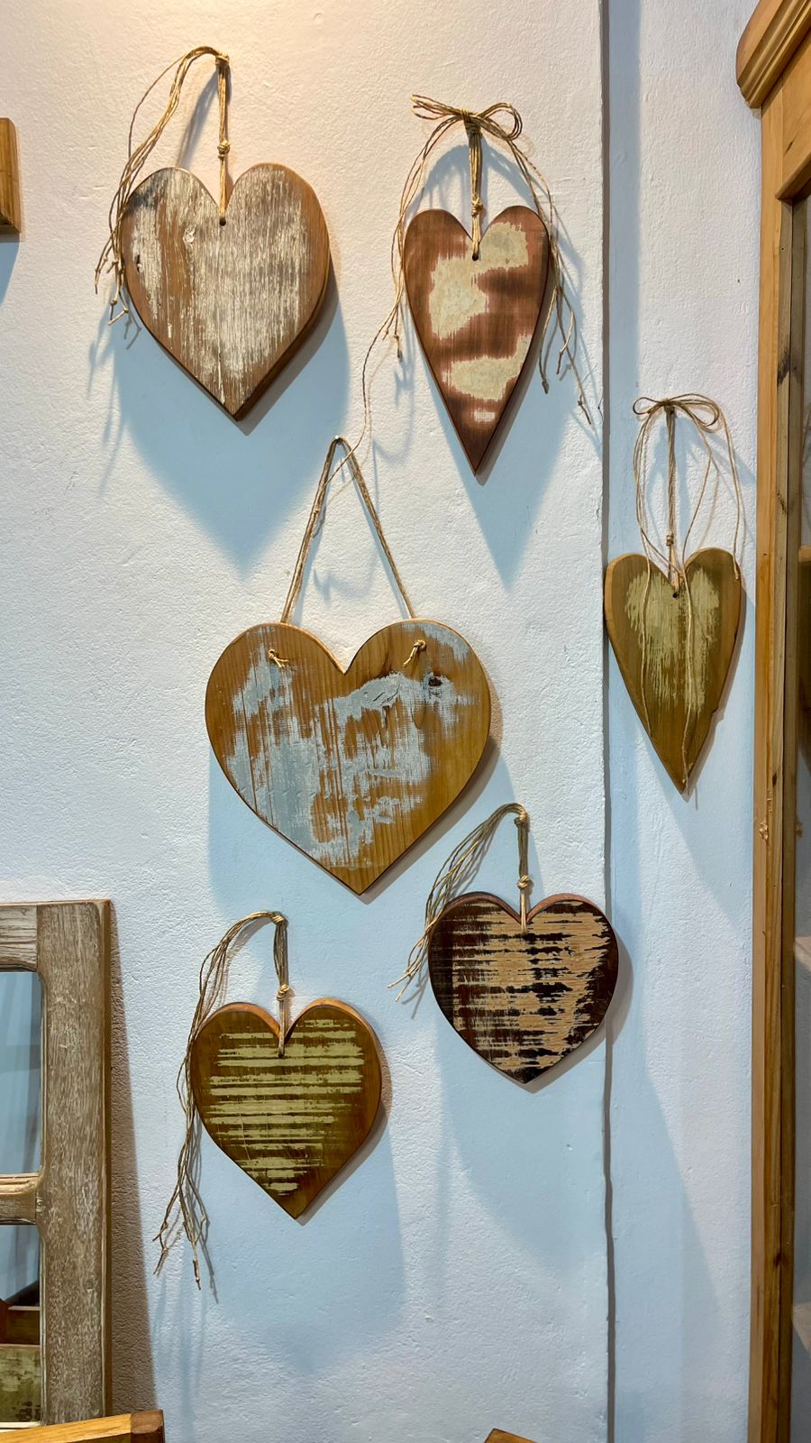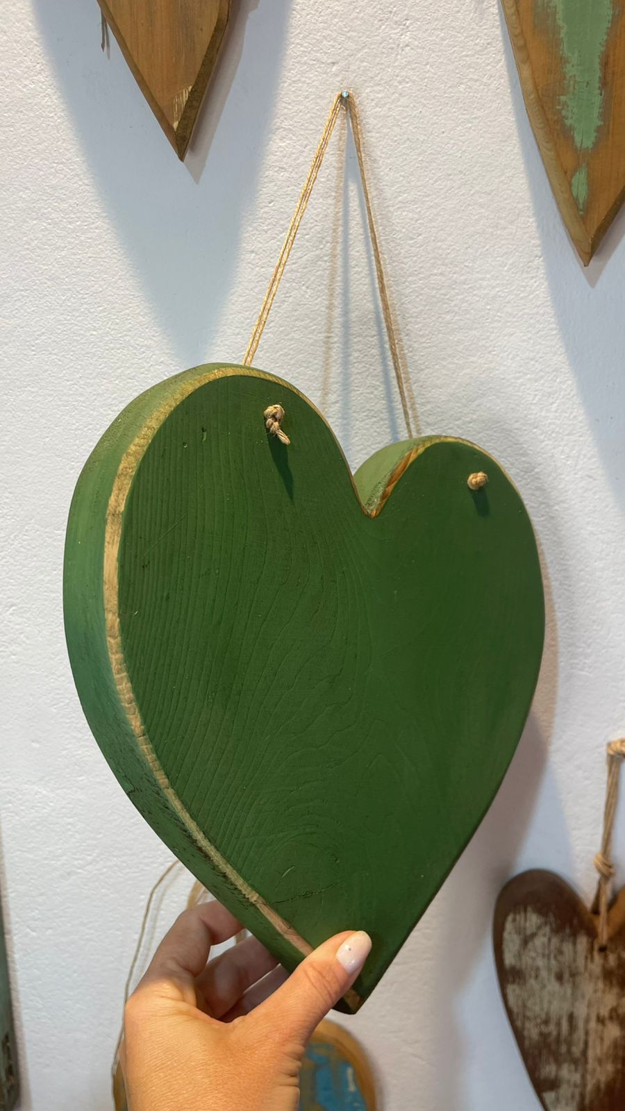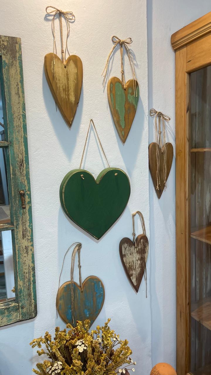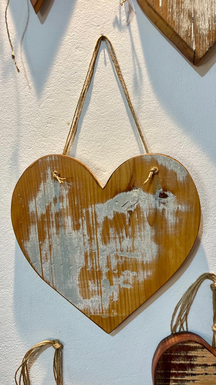 Nosso coração é feito artesanalmente em madeira de demolição, com acabamento desgastado que revela a beleza natural do tempo e da história da peça.